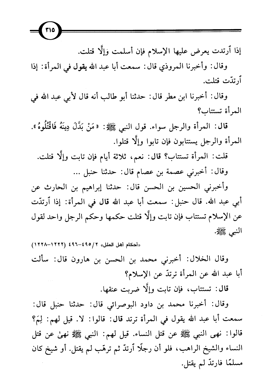 وقال: أخبرنا محمد بن داود البوصرائي قال: حدثنا حنبل قال: سمعت أبا عبد اللَّه يقول في المرأة ترتد قال: قالوا: لا. قيل لهم: لِمَ؟ قالوا: نهى النبي -صلى اللَّه عليه وسلم- عن قتل النساء. قيل لهم: النبي -صلى اللَّه عليه وسلم- نهى عن قتل النساء والشيخ الراهب، فلو أن رجلًا ارتدّ ثم ترهّب لم يقتل. أو شيخ كان مسلمًا فارتدّ لم يقتل.