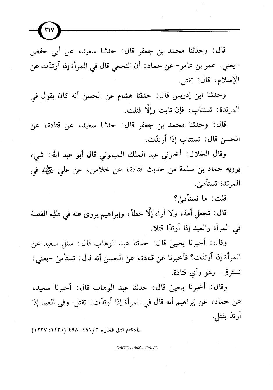 قال: وحدثنا محمد بن جعفر قال: حدثنا سعيد، عن أبي حفص -يعني: عمر بن عامر- عن حماد: أن النخعي قال في المرأة إذا ارتدّت عن الإسلام، قال: تقتل.
