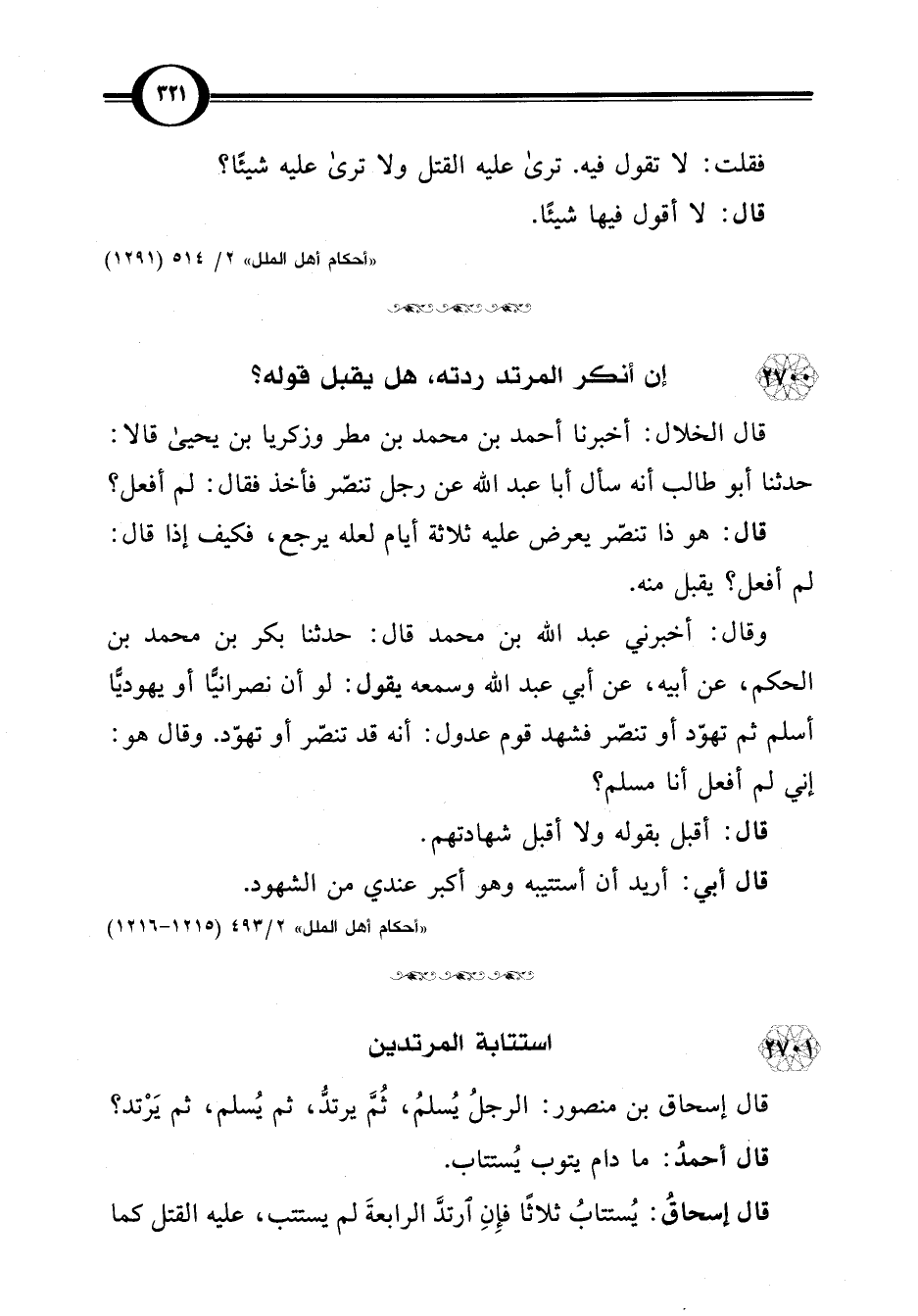 قال إسحاق بن منصور: الرجلُ يُسلمُ، ثُمَّ يرتدُّ، ثم يُسلم، ثم يَرْتد؟