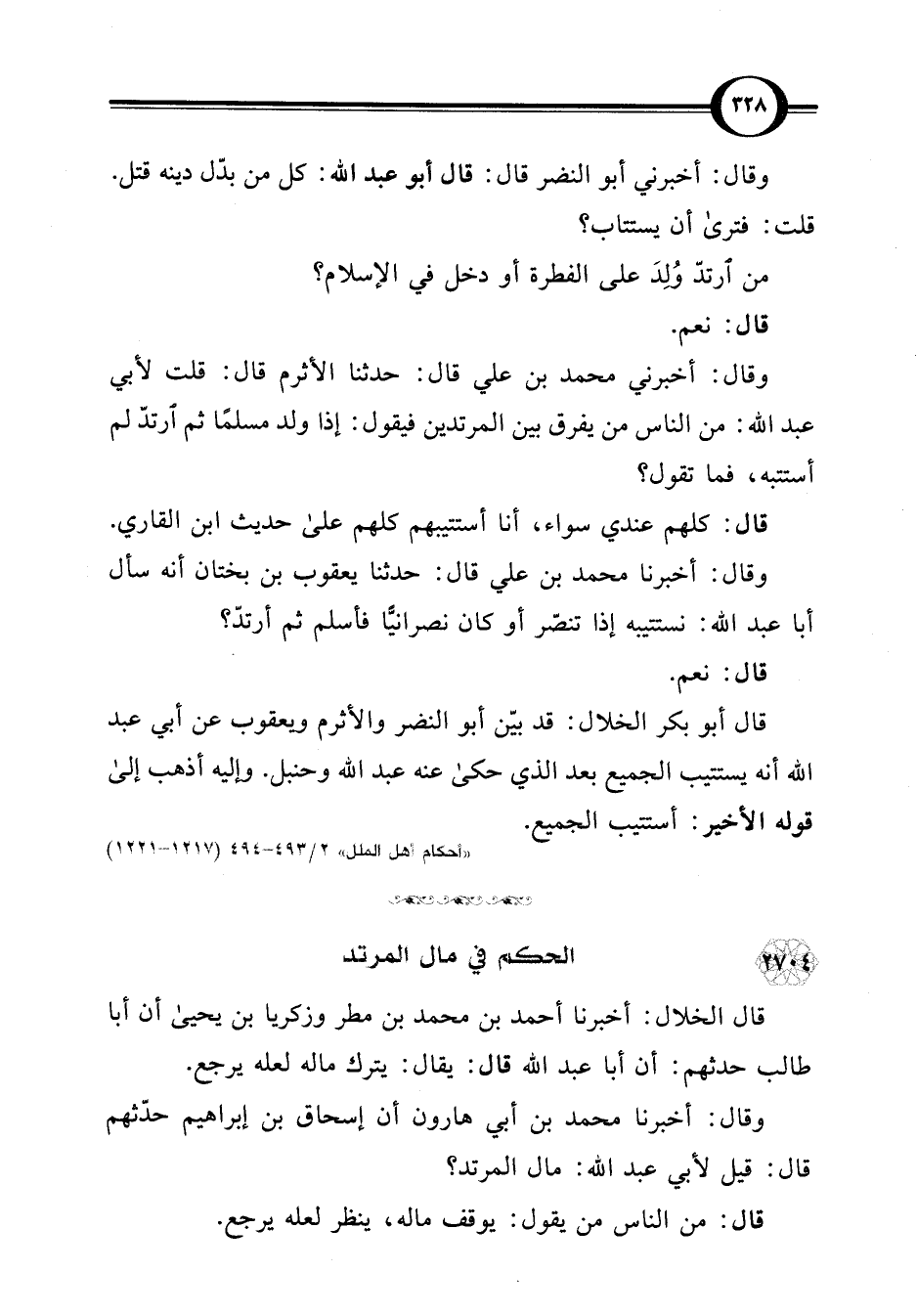 وقال: أخبرني أبو النضر قال: قال أبو عبد اللَّه: كل من بدّل دينه قتل. قلت: فترى أن يستتاب؟