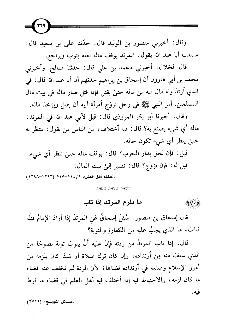 وقال: أخبرني منصور بن الوليد قال: حدثنا علي بن سعيد قال: سمعت أبا عبد اللَّه يقول: المرتد يوقف ماله لعله يتوب ويراجع.