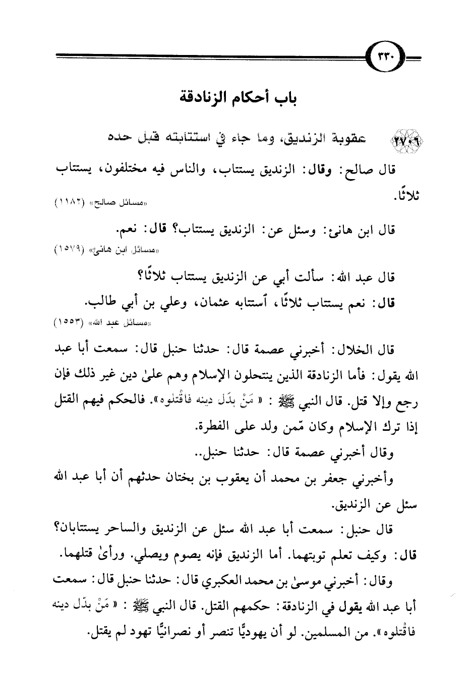 قال صالح: وقال: الزنديق يستتاب، والناس فيه مختلفون، يستتاب ثلاثًا.