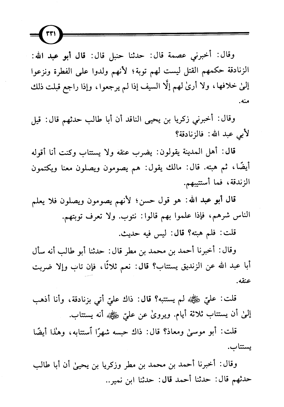 وقال: أخبرني زكريا بن يحيى الناقد أن أبا طالب حدثهم قال: قيل لأبي عبد اللَّه: فالزنادقة؟