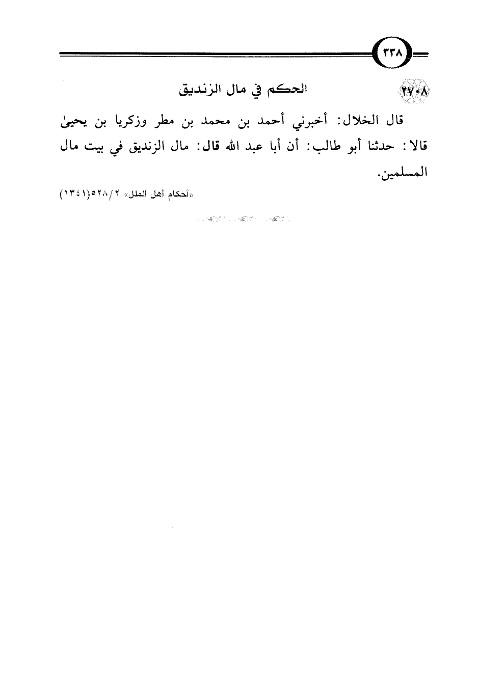قال الخلال: أخبرني أحمد بن محمد بن مطر وزكريا بن يحيى قالا: حدثنا أبو طالب: أن أبا عبد اللَّه قال: مال الزنديق في بيت مال المسلمين.