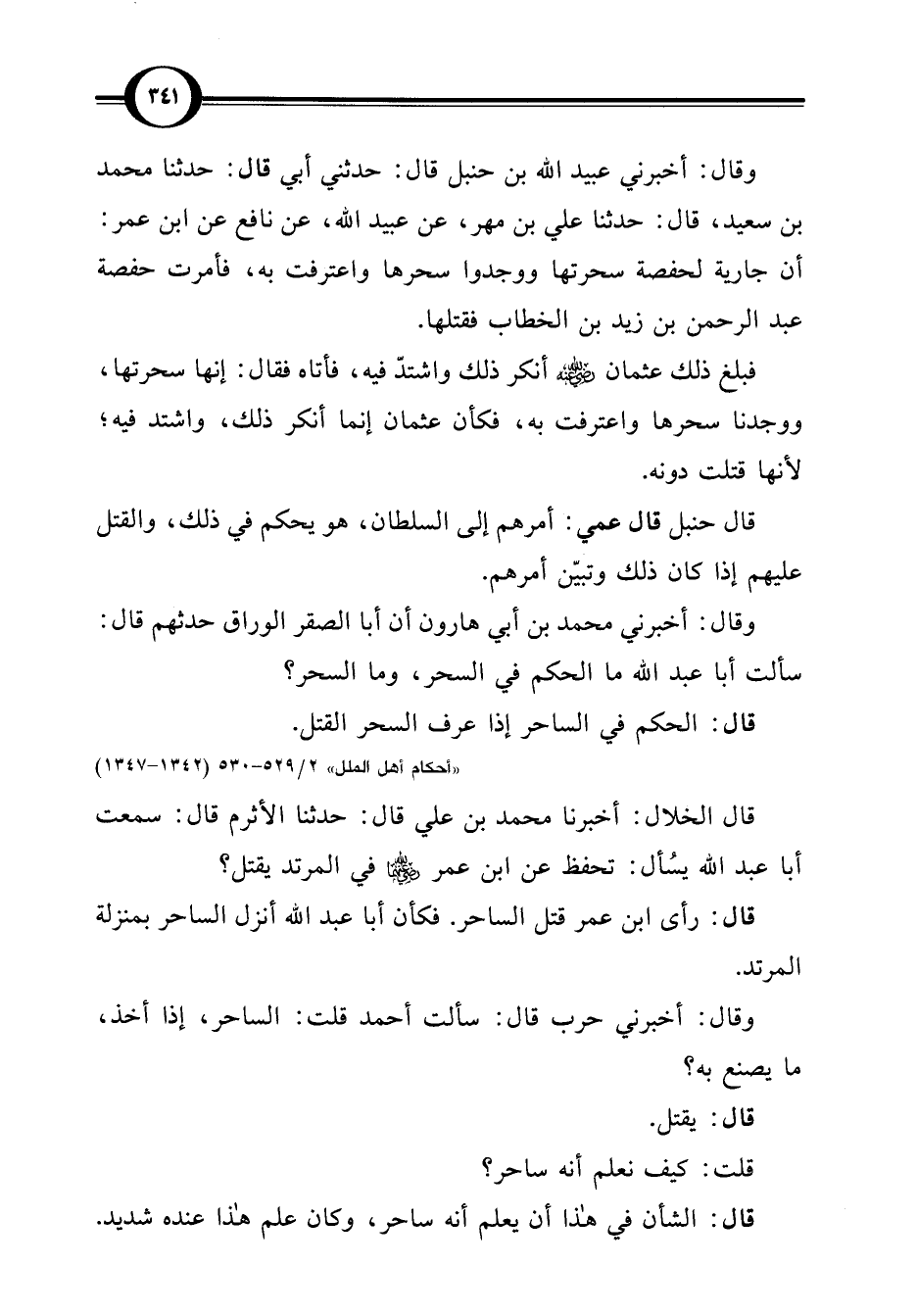 وقال: أخبرني عبيد اللَّه بن حنبل قال: حدثني أبي قال: حدثنا محمد بن سعيد، قال: حدثنا علي بن مهر، عن عبيد اللَّه، عن نافع عن ابن عمر: أن جارية لحفصة سحرتها ووجدوا سحرها واعترفت به، فأمرت حفصة عبد الرحمن بن زيد بن الخطاب فقتلها.