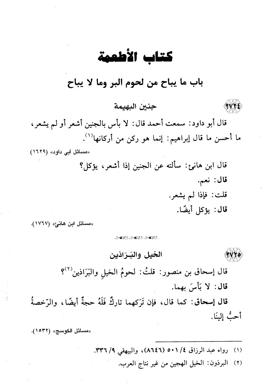 قال إسحاق بن منصور: قلتُ: لحومُ الخيلِ والبَرَاذين (¬2)؟