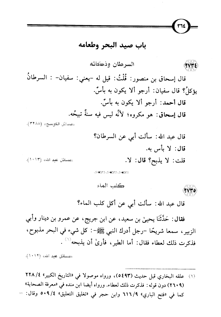قال إسحاق بن منصورْ قُلْتُ: قيل له -يعني: سفيان-: السرطانُ يؤكلُ؟ قال سفيان: أرجو ألا يكون به بأسٌ.
