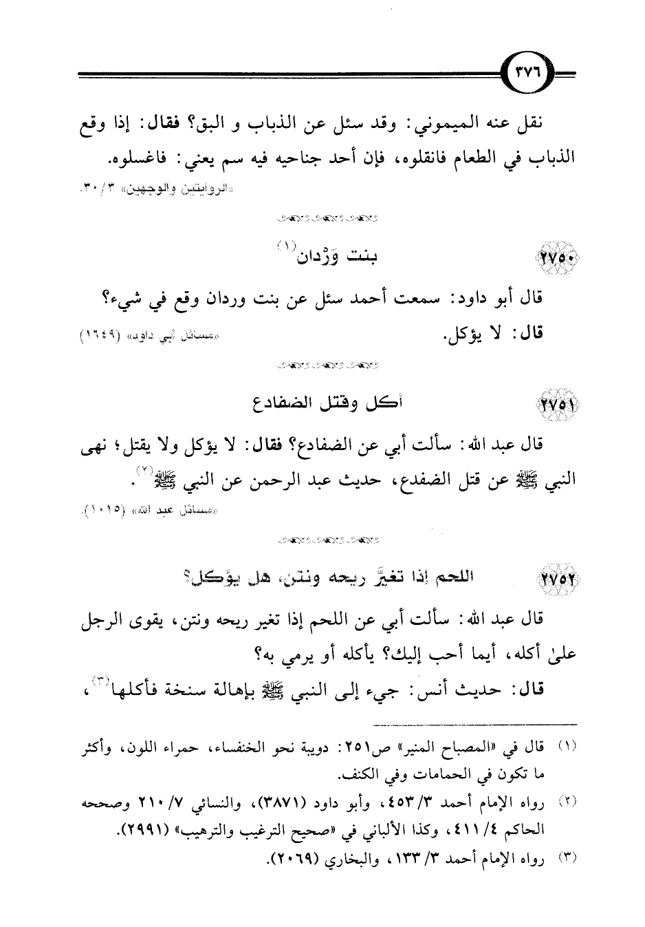 قال عبد اللَّه: سألت أبي عن الضفادع؟ فقال: لا يؤكل ولا يقتل؛ نهى النبي -صلى اللَّه عليه وسلم- عن قتل الضفدع، حديث عبد الرحمن عن النبي -صلى اللَّه عليه وسلم- (¬2).
