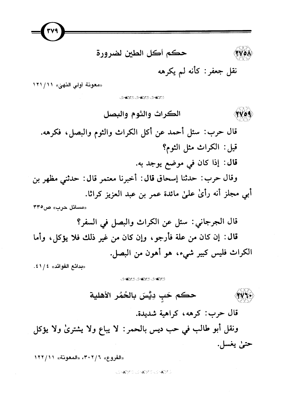 قال حرب: سئل أحمد عن أكل الكراث والثوم والبصل، فكرهه.
