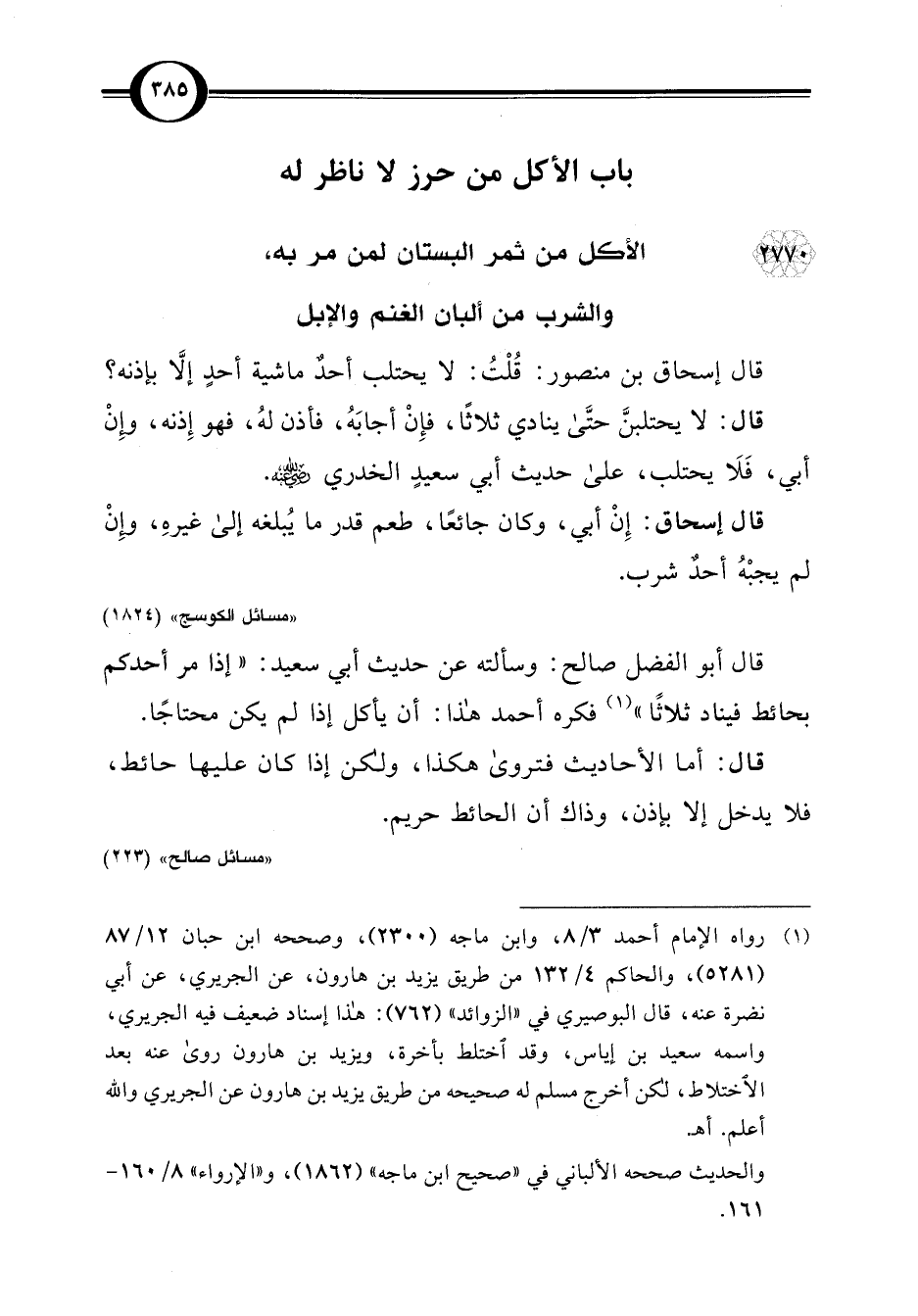 2770 - الأكل من ثمر البستان لمن مر به، والشرب من ألبان الغنم والإبل