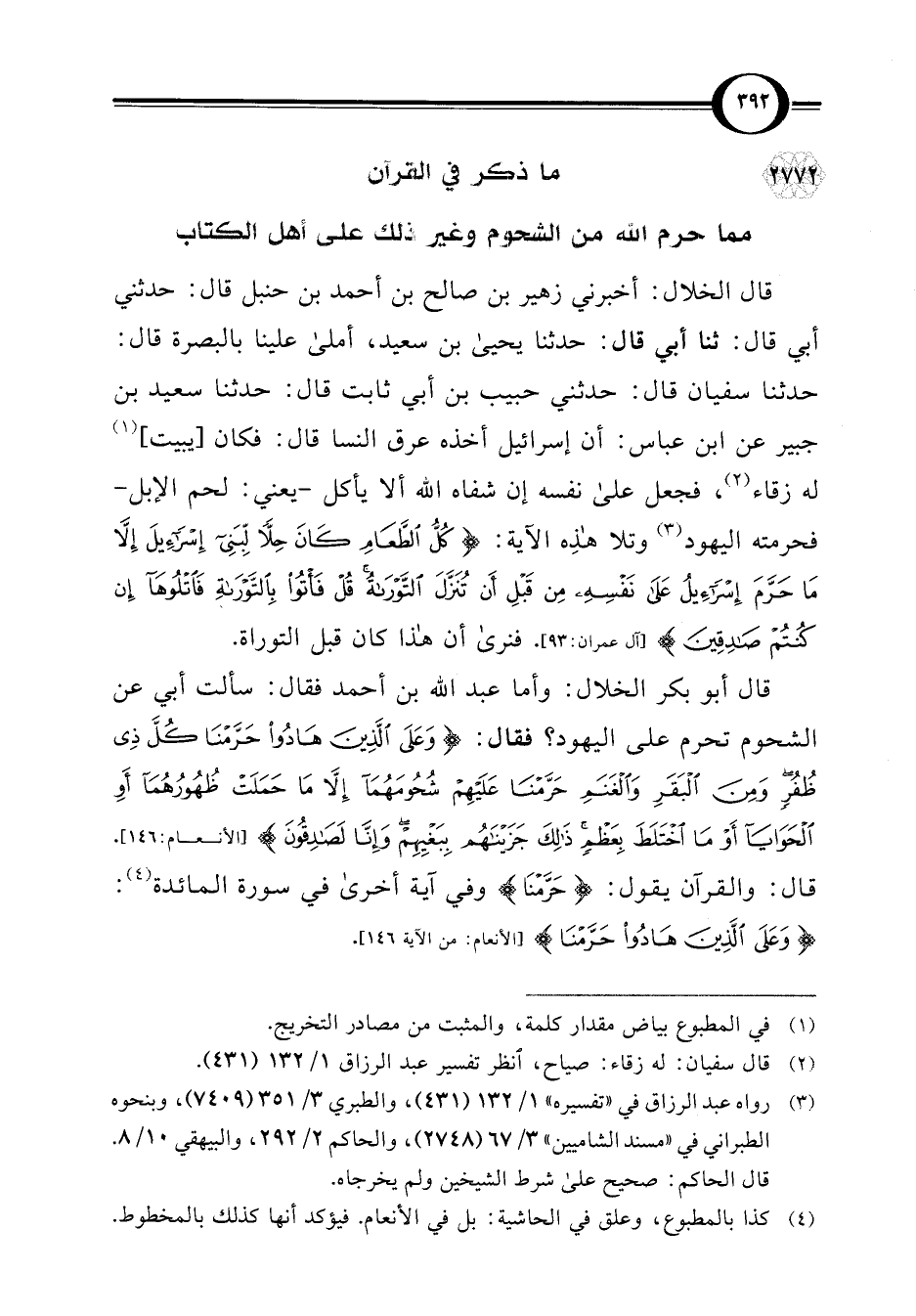 قال أبو بكر الخلال: وأما عبد اللَّه بن أحمد فقال: سألت أبي عن الشحوم تحرم على اليهود؟ فقال: {وَعَلَى الَّذِينَ هَادُوا حَرَّمْنَا كُلَّ ذِي ظُفُرٍ وَمِنَ الْبَقَرِ وَالْغَنَمِ حَرَّمْنَا عَلَيْهِمْ شُحُومَهُمَا إِلَّا مَا حَمَلَتْ ظُهُورُهُمَا أَوِ الْحَوَايَا أَوْ مَا اخْتَلَطَ بِعَظْمٍ ذَلِكَ جَزَيْنَاهُمْ بِبَغْيِهِمْ وَإِنَّا لَصَادِقُونَ} [الأنعام: 146]. قال: والقرآن يقول: {حَرَّمْنَا} وفي آية أخرى في سورة المائدة (¬4): {وَعَلَى الَّذِينَ هَادُوا حَرَّمْنَا} [الأنعام: من الآية 146].