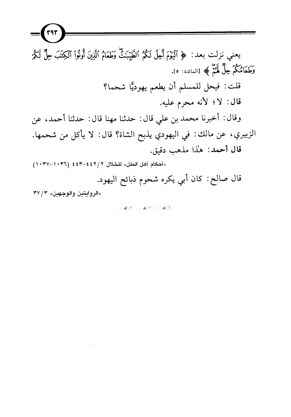 قال صالح: كان أبي يكره شحوم ذبائح اليهود.