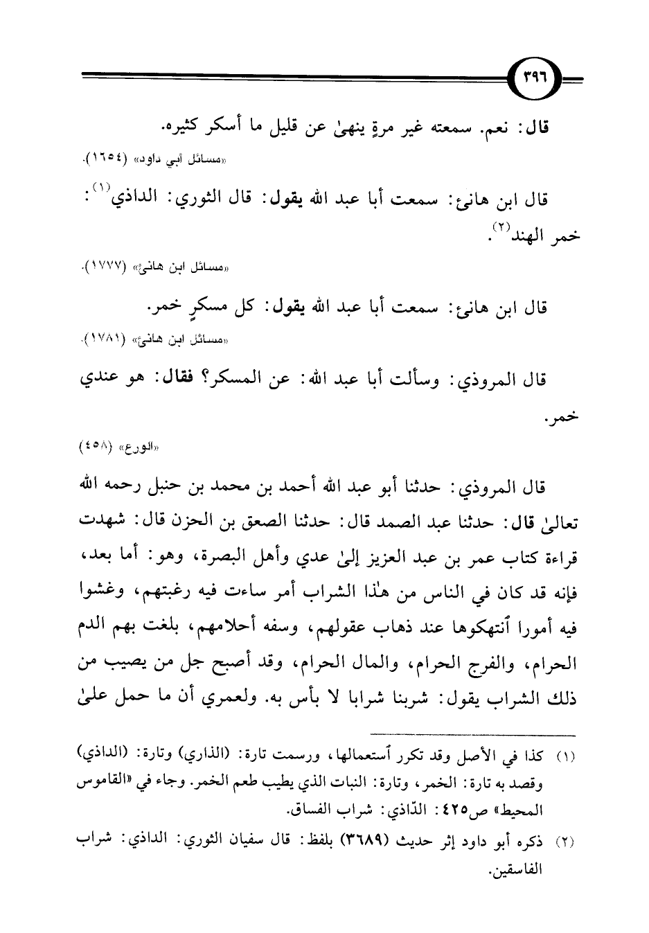 قال المروذي: حدثنا أبو عبد اللَّه أحمد بن محمد بن حنبل رحمه اللَّه تعالى قال: حدثنا عبد الصمد قال: حدثنا الصعق بن الحزن قال: شهدت قراءة كتاب عمر بن عبد العزيز إلى عدي وأهل البصرة، وهو: أما بعد، فإنه قد كان في الناس من هذا الشراب أمر ساءت فيه رغبتهم، وغشوا فيه أمورا انتهكوها عند ذهاب عقولهم، وسفه أحلامهم، بلغت بهم الدم الحرام، والفرج الحرام، والمال الحرام، وقد أصبح جل من يصيب من ذلك الشراب يقول: شربنا شرابا لا بأس به. ولعمري أن ما حمل على