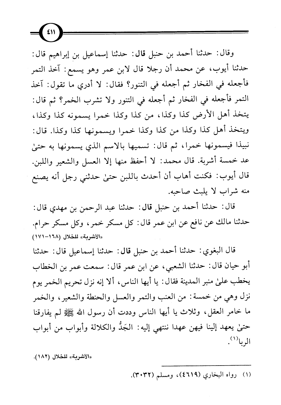 وقال: حدثنا أحمد بن حنبل قال: حدثنا إسماعيل بن إبراهيم قال: حدثنا أيوب، عن محمد أن رجلا قال لابن عمر وهو يسمع: آخذ التمر فأجعله في الفخار ثم أجعله في التنور؟ فقال: لا أدري ما تقول: آخذ التمر فأجعله في الفخار ثم أجعله في التنور ولا تشرب الخمر؟ ثم قال: يتخذ أهل الأرض كذا وكذا، من كذا وكذا خمرا يسمونه كذا وكذا، ويتخذ أهل كذا وكذا من كذا وكذا خمرا ويسمونها كذا وكذا. قال: نبيذا فيسمونها خمرا، ثم قال: تسميها بالاسم الذي يسمونها به حتى عد خمسة أشربة. قال محمد: لا أحفظ منها إلا العسل والشعير واللبن. قال أيوب: فكنت أهاب أن أحدث باللبن حتى حدثني رجل أنه يصنع منه شراب لا يلبث صاحبه.