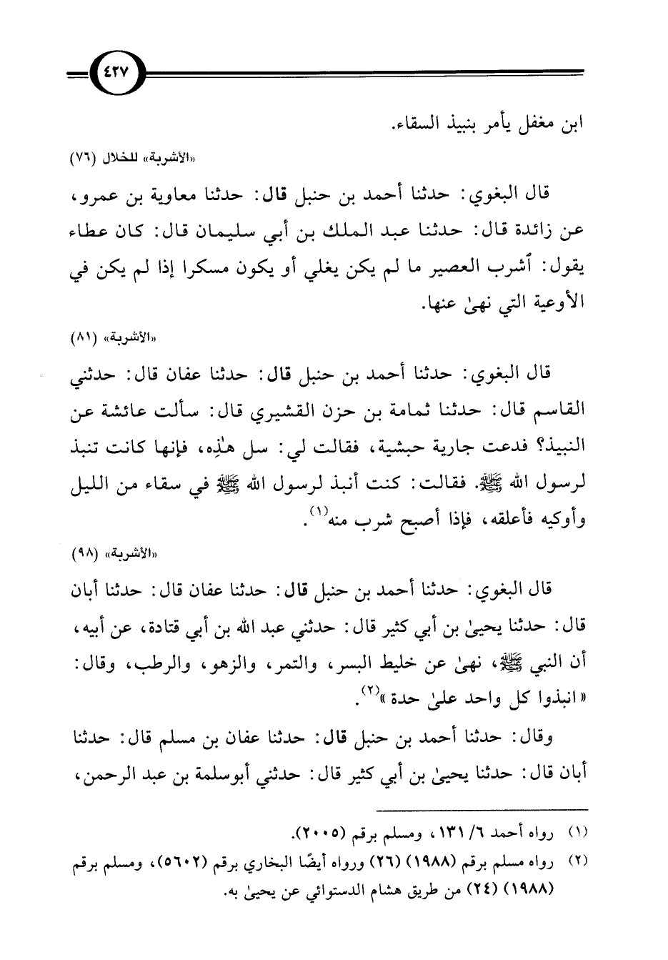 قال البغوي: حدثنا أحمد بن حنبل قال: حدثنا عفان قال: حدثني القاسم قال: حدثنا ثمامة بن حزن القشيري قال: سألت عائشة عن النبيذ؟ فدعت جارية حبشية، فقالت لي: سل هذِه، فإنها كانت تنبذ لرسول اللَّه -صلى اللَّه عليه وسلم-. فقالت: كنت أنبذ لرسول اللَّه -صلى اللَّه عليه وسلم- في سقاء من الليل وأوكيه فأعلقه، فإذا أصبح شرب منه (¬1).