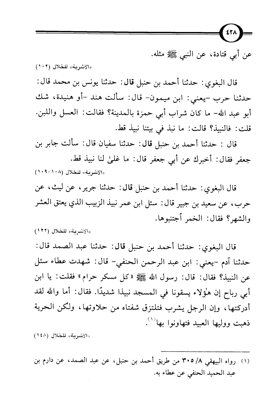 قال البغوي: حدثنا أحمد بن حنبل قال: حدثنا عبد الصمد قال: حدثنا آدم -يعني: ابن عبد الرحمن الحنفي- قال: شهدت عطاء سئل عن النبيذ؟ فقال: قال: رسول اللَّه -صلى اللَّه عليه وسلم- "كل مسكر حرام" فقلت: يا ابن أبي رباح إن هؤلاء يسقونا في المسجد نبيذا شديدًا. فقال: أما واللَّه لقد أدركتها، وإن الرجل يشرب فتلتزق شفتاه من حلاوتها، ولكن الحرية ذهبت ووليها العبيد فتهاونوا بها (¬1).