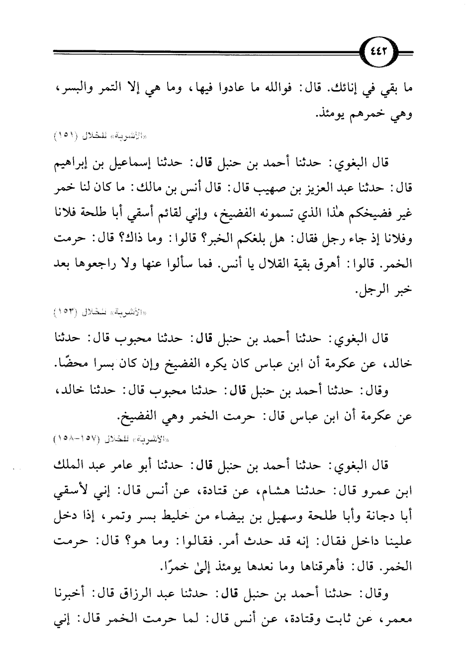 قال البغوي: حدثنا أحمد بن حنبل قال: حدثنا إسماعيل بن إبراهيم قال: حدثنا عبد العزيز بن صهيب قال: قال أنس بن مالك: ما كان لنا خمر غير فضيخكم هذا الذي تسمونه الفضيخ، وإني لقائم أسقي أبا طلحة فلانا وفلانا إذ جاء رجل فقال: هل بلغكم الخبر؟ قالوا: وما ذاك؟ قال: حرمت الخمر. قالوا: أهرق بقية القلال يا أنس. فما سألوا عنها ولا راجعوها بعد خبر الرجل.