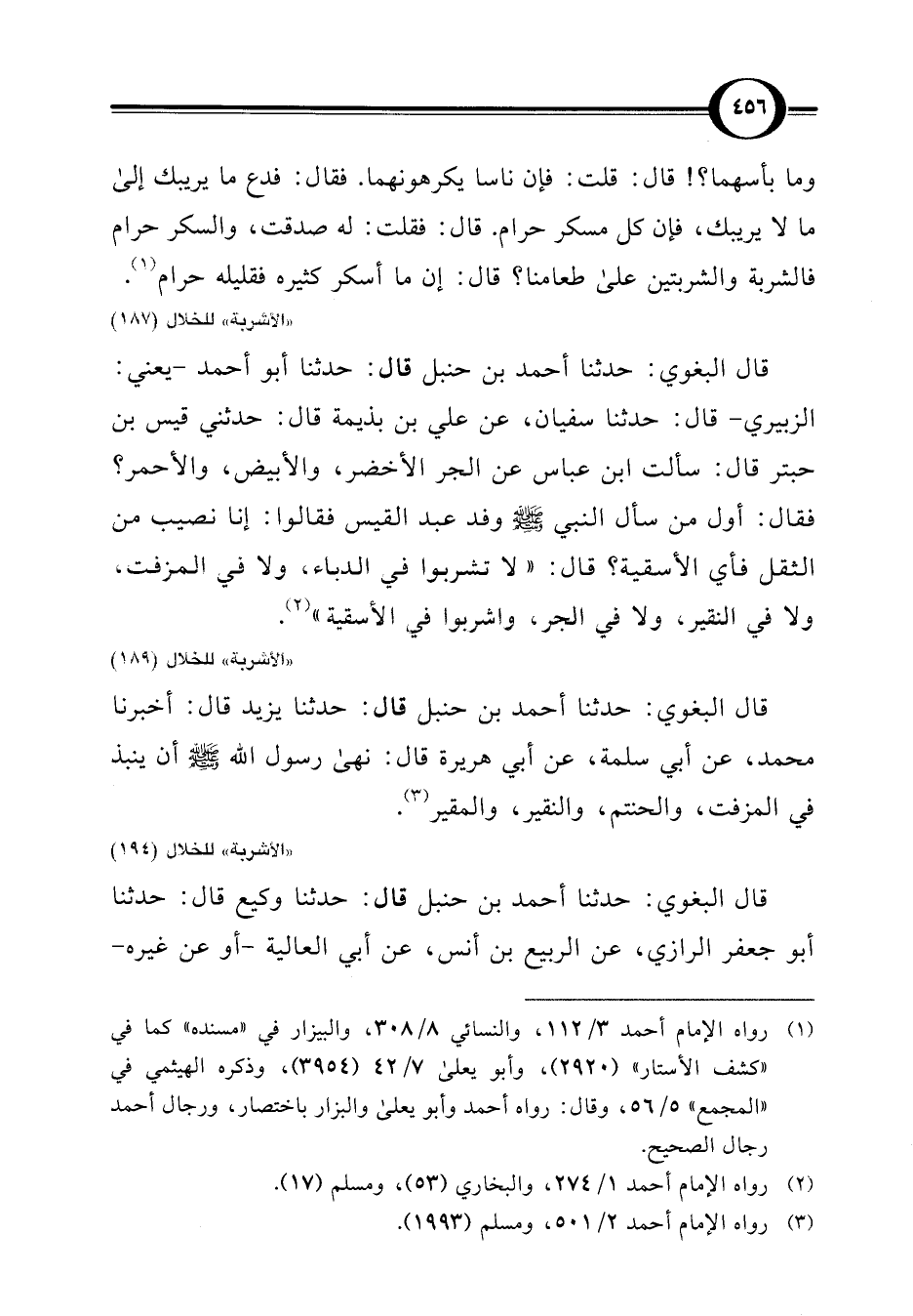 قال البغوي: حدثنا أحمد بن حنبل قال: حدثنا أبو أحمد -يعني: الزبيري- قال: حدثنا سفيان، عن علي بن بذيمة قال: حدثني قيس بن حبتر قال: سألت ابن عباس عن الجر الأخضر، والأبيض، والأحمر؟ فقال: أول من سأل النبي -صلى اللَّه عليه وسلم- وفد عبد القيس فقالوا: إنا نصيب من الثقل فأي الأسقية؟ قال: "لا تشربوا في الدباء، ولا في المزفت، ولا في النقير، ولا في الجر، واشربوا في الأسقية" (¬2).