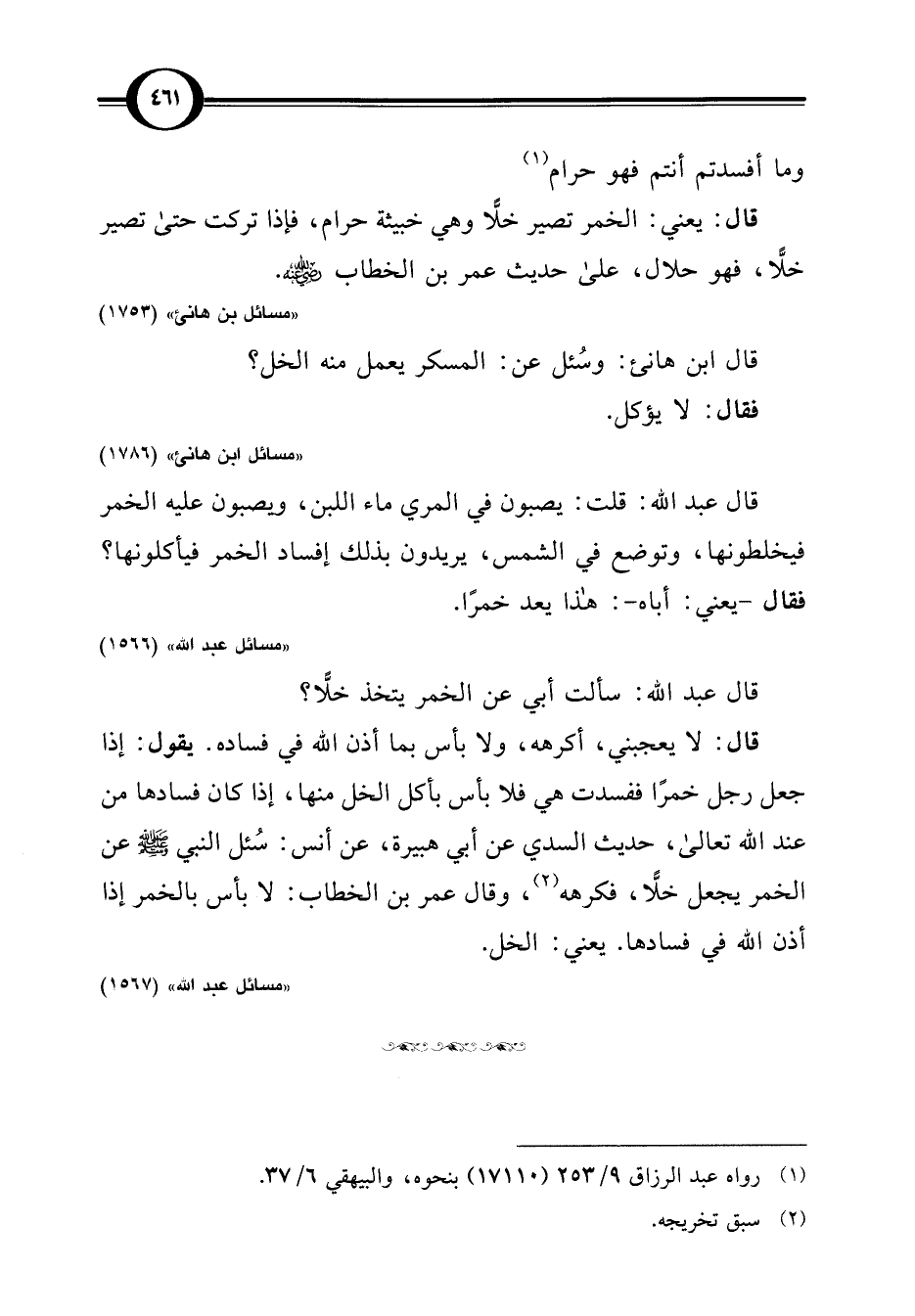 قال عبد اللَّه: قلت: يصبون في المري ماء اللبن، ويصبون عليه الخمر فيخلطونها، وتوضع في الشمس، يريدون بذلك إفساد الخمر فيأكلونها؟ فقال -يعني: أباه-: هذا يعد خمرًا.
