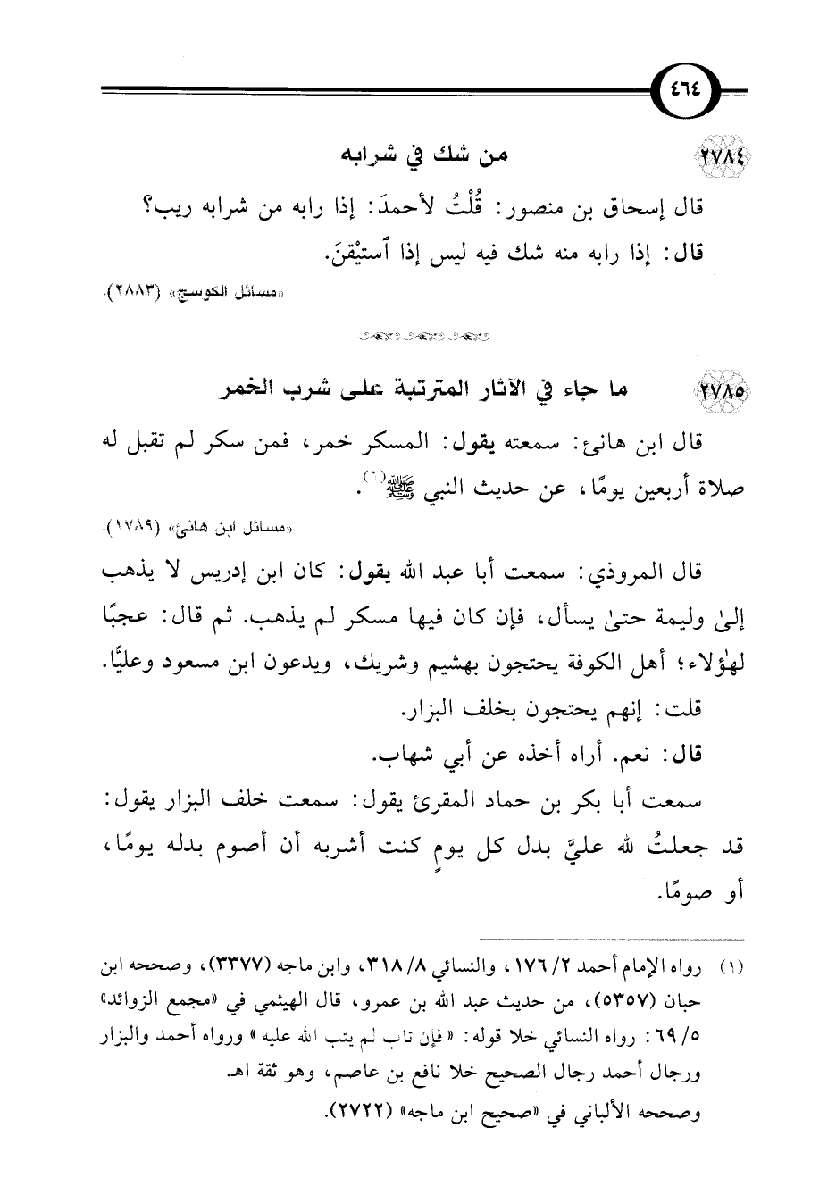 قال ابن هانئ: سمعته يقول: المسكر خمر، فمن سكر لم تقبل له صلاة أربعين يومًا، عن حديث النبي -صلى اللَّه عليه وسلم- (¬1).