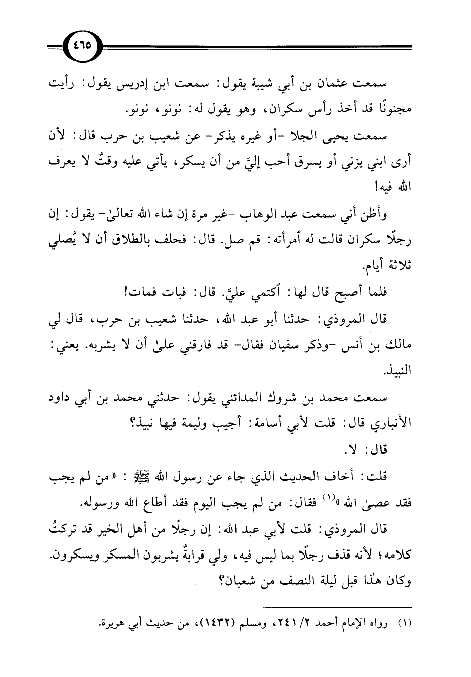قال المروذي: قلت لأبي عبد اللَّه: إن رجلًا من أهل الخير قد تركتُ كلامه؛ لأنه قذف رجلًا بما ليس فيه، ولي قرابةٌ يشربون المسكر ويسكرون. وكان هذا قبل ليلة النصف من شعبان؟