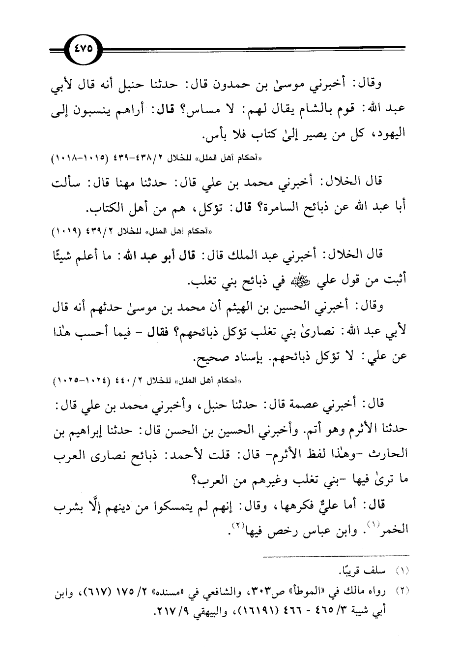 "أحكام أهل الملل" للخلال 2/ 438 - 439 (1015 - 1018)