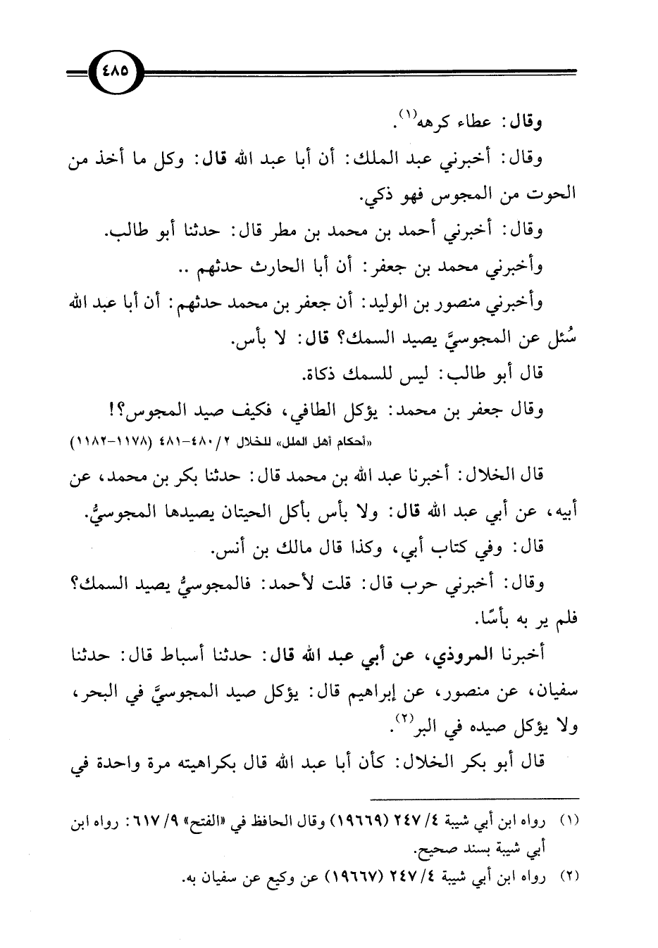 قال الخلال: أخبرنا عبد اللَّه بن محمد قال: حدثنا بكر بن محمد، عن أبيه، عن أبي عبد اللَّه قال: ولا بأس بأكل الحيتان يصيدها المجوسيُّ.