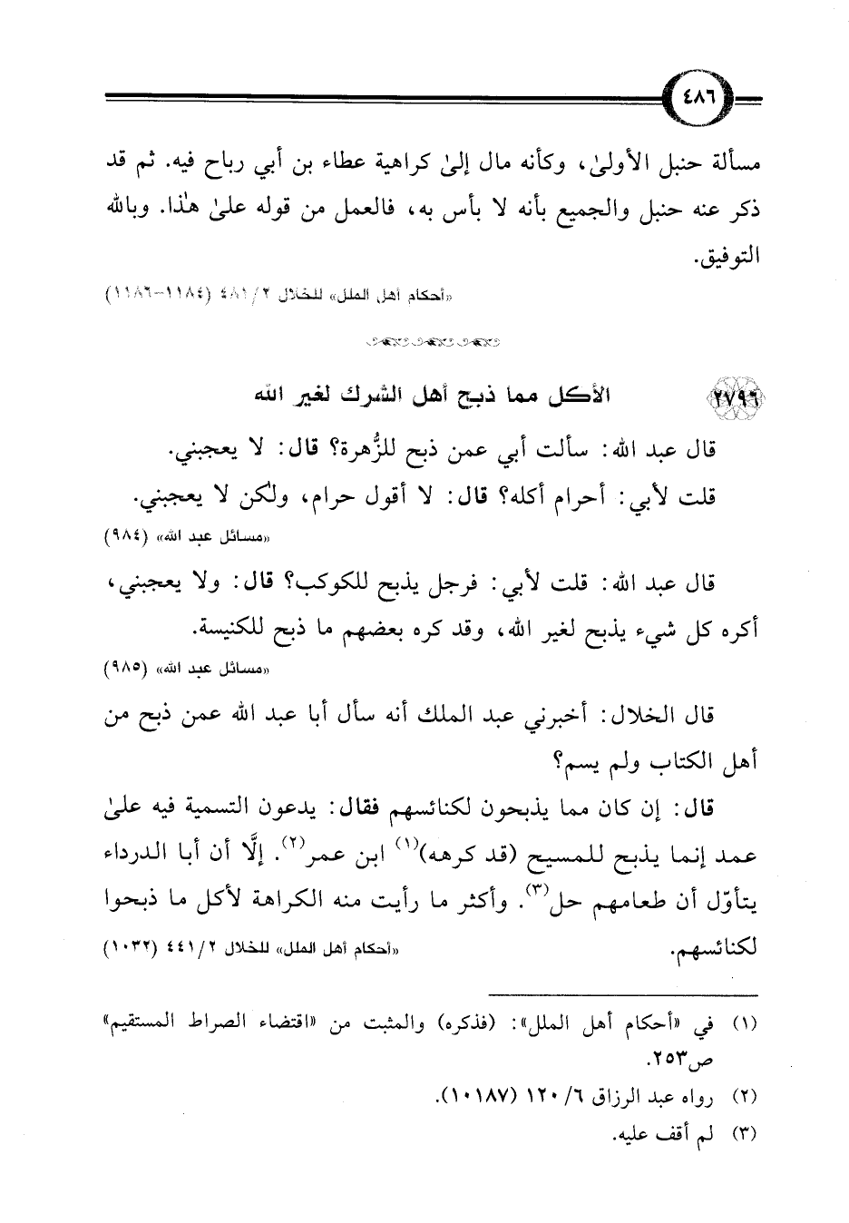 "أحكام أهل الملل" للخلال 2/ 481 (1184 - 1186)
