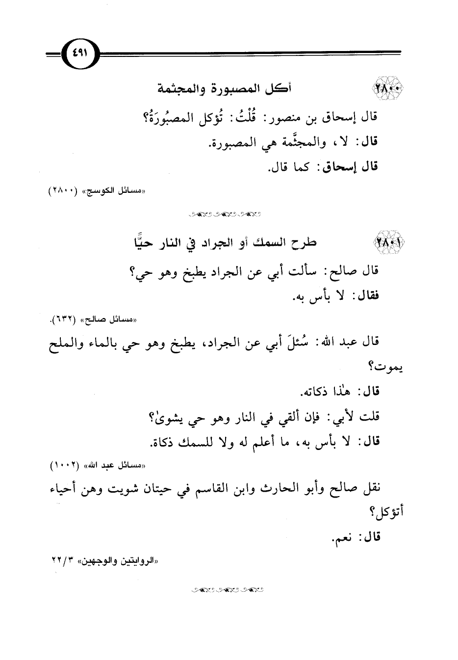 قال عبد اللَّه: سُئلَ أبي عن الجراد، يطبخ وهو حي بالماء والملح يموت؟