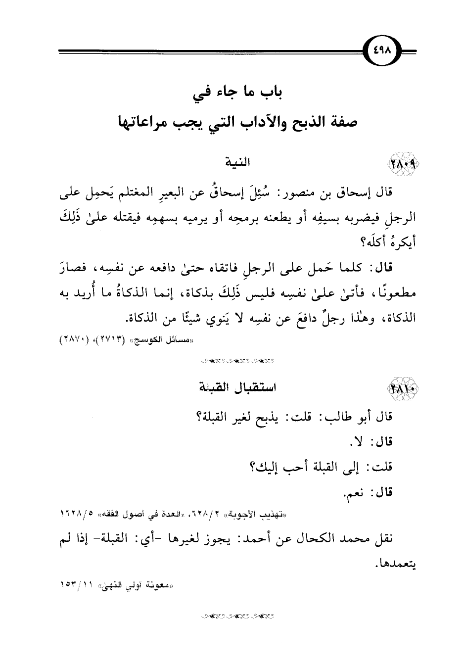 قال إسحاق بن منصور: سُئِلَ إسحاقُ عن البعيرِ المغتلم يَحمِل على الرجلِ فيضربه بسيفِه أو يطعنه برمحِه أو يرميه بسهمِه فيقتله على ذَلِكَ أيكرهُ أكلَه؟