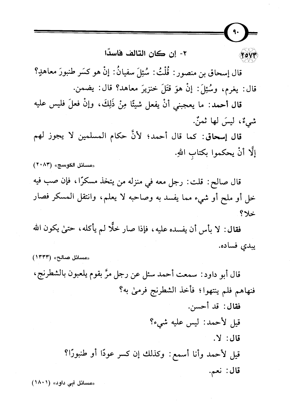 قال إسحاق بن منصور: قُلْتُ: سُئِلَ سفيانُ: إنْ هو كسَر طنبورَ معاهدٍ؟ قال: يغرم، وسُئِلَ: إنْ هوَ قتَلَ خنزيرَ معاهد؟ قال: يضمن.