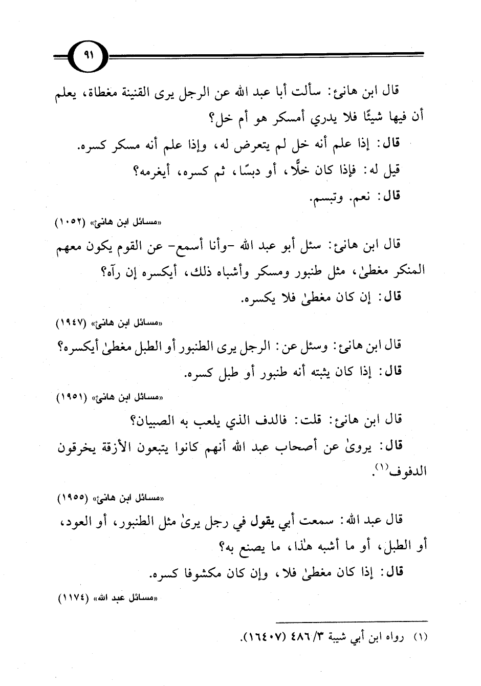 قال ابن هانئ: وسئل عن: الرجل يرى الطنبور أو الطبل مغطى أيكسره؟