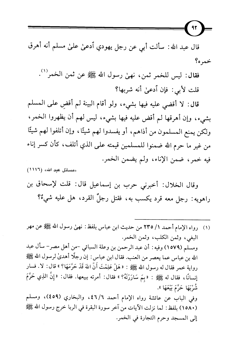 قال عبد اللَّه: سألت أبي عن رجل يهودي ادعى على مسلم أنه أهرق خمره؟