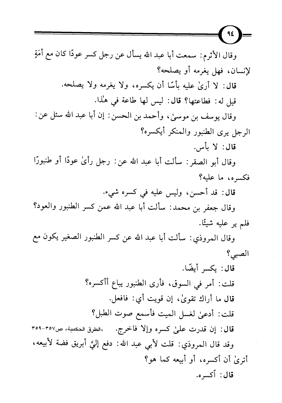 وقال يوسف بن موسى، وأحمد بن الحسن: إن أبا عبد اللَّه سئل عن: الرجل يرى الطنبور والمنكر أيكسره؟