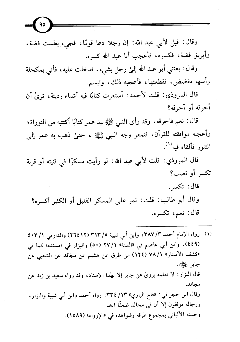 وقال: قيل لأبي عبد اللَّه: إن رجلا دعا قومًا، فجيء بطست فضة، وأبريق فضة، فكسره، فأعجب أبا عبد اللَّه كسره.