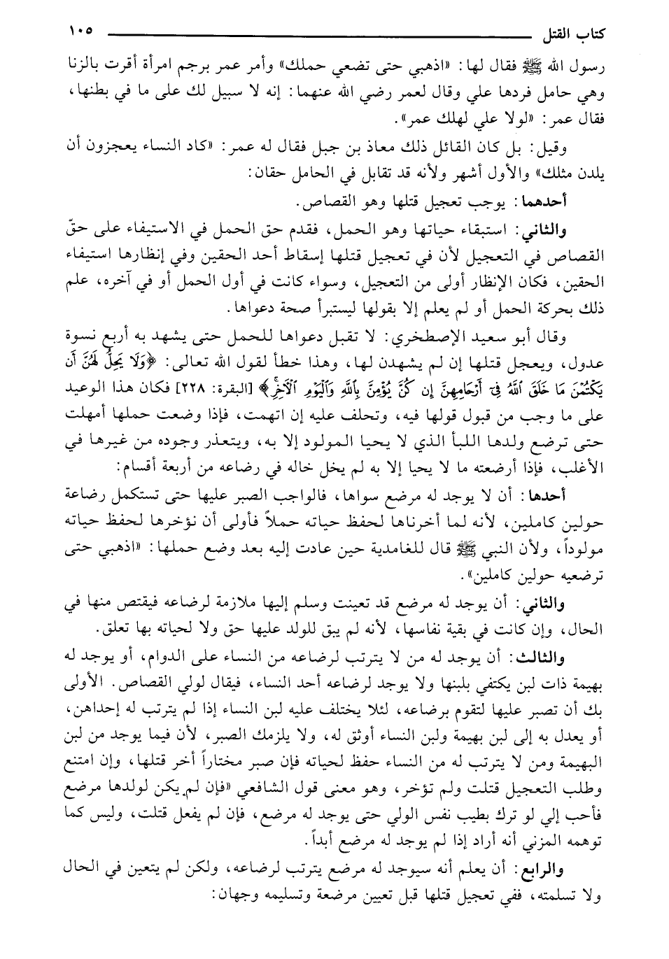 والثالث: أن يوجد له من لا يترتب لرضاعه من النساء على الدوام، أو يوجد له بهيمة ذات لبن يكتفي بلبنها ولا يوجد لرضاعه أحد النساء، فيقال لولي القصاص. الأولى بك أن تصبر عليها لتقوم برضاعه، لئلا يختلف عليه لبن النساء إذا لم يترتب له إحداهن، أو يعدل به إلى لبن بهيمة ولبن النساء أوثق له، ولا يلزمك الصبر، لأن فيما يوجد من لبن البهيمة ومن لا يترتب له من النساء حفظ لحياته فإن صبر مختارا أخر قتلها، وإن امتنع وطلب التعجيل قتلت ولم تؤخر، وهو معنى قول الشافعي "فإن لم يكن لولدها مرضع فأحب إلي لو ترك بطيب نفس الولي حتى يوجد له مرضع، فإن لم يفعل قتلت، وليس كما توهمه المزني أنه أراد إذا لم يوجد له مرضع أبدا.