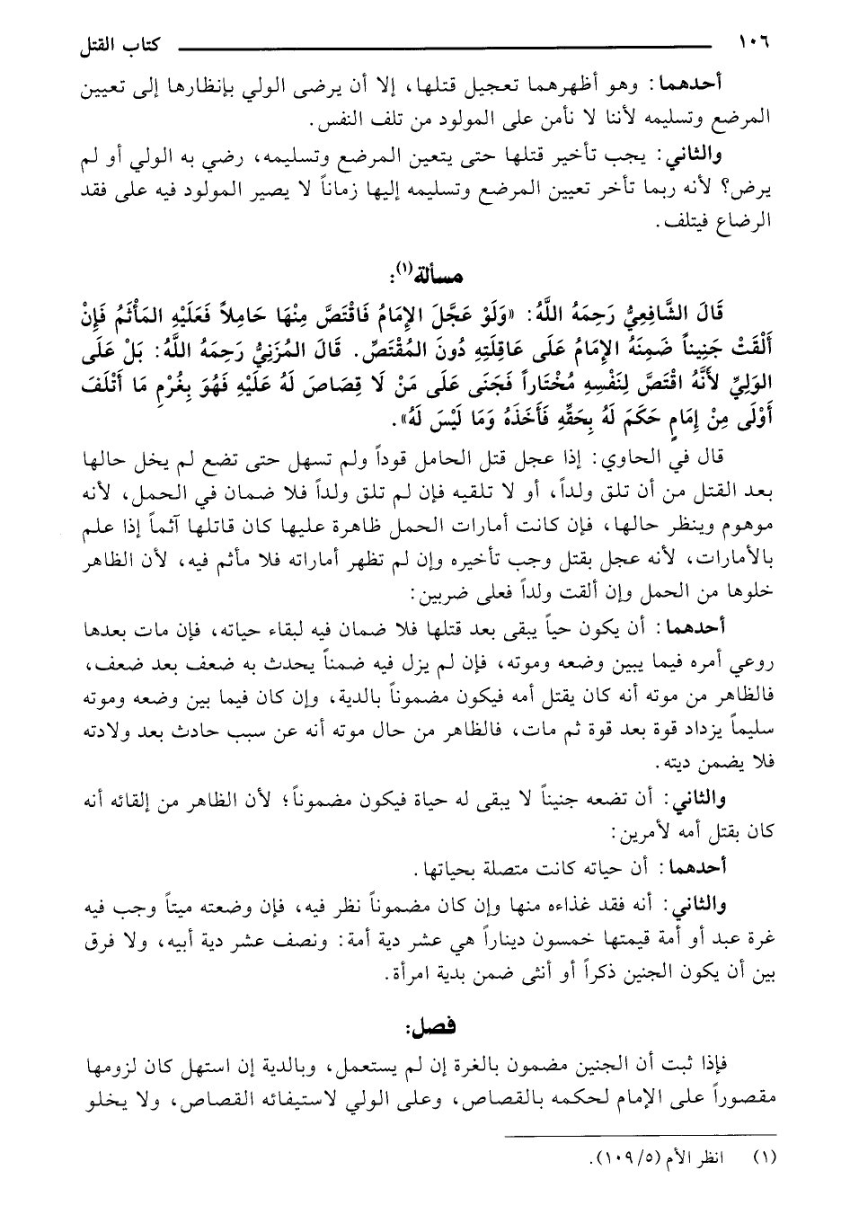 قال الشافعي رحمه الله: "ولو عجل الإمام فاقتص منها حاملا فعليه المأثم فإن ألقت جنينا ضمنه الإمام على عاقلته دون المقتص. قال المزني رحمه الله: بل على الولي لأنه اقتص لنفسه مختارا فجني على من لا قصاص له عليه فهو بغرم ما أتلف أولى من إمام حكم له بحقه فأخذه وما ليس له".
