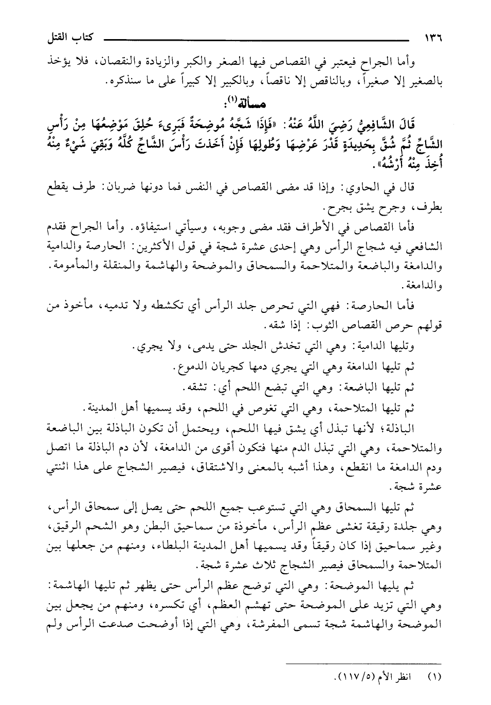 قال الشافعي رضي الله عنه: "فإذا شجه موضحة فبراء حلق موضعها من رأس الشاج ثم شق بحديدة قدر عضها وطولها فإن أخذت رأس الشاج كله ويبقى شيء منه أخذ منه أرضه".