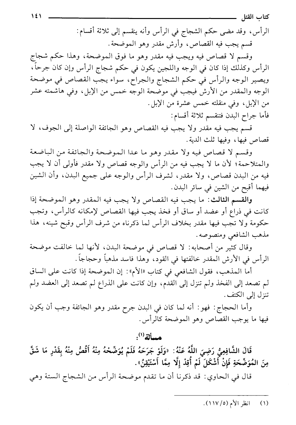 أم المذهب فقول الشافعي في كتاب "الأم": إن الموضحة إذا كانت على الساق لم تصعد إلي الفخذ ولم تنزل إلي القدم, وإن كانت على الذراع لم تصعد إلي العضد ولم تنزل إلي الكتف.