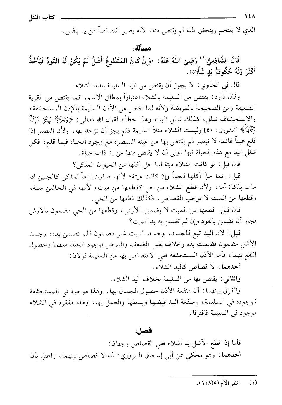قال الشافعي رضي الله عنه: "وإن كان المقطوع أشل لم يكن له القود فيأخذ أكثر وله حكومة يد شلاء".
