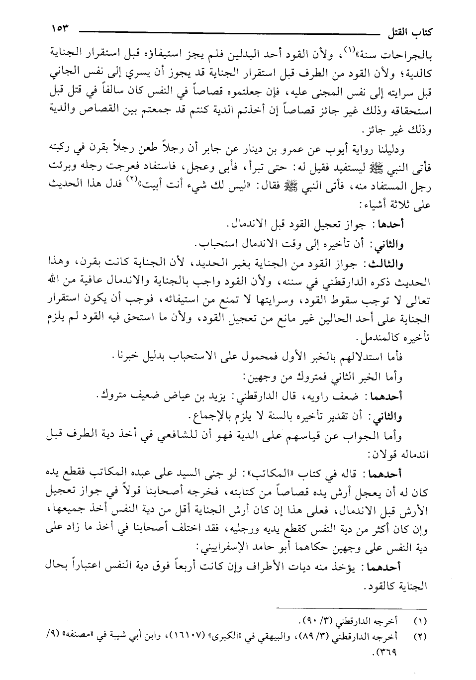 والثالث: جواز القود من الجناية بغير الحديد، لأن الجناية كانت بقرن، وهذا الحديث ذكره الدارقطني في سننه، ولأن القود واجب بالجنايةً والاندمال عافيةً من الله تعالى لا توجب سقوط القود، وسرايتها لا تمنع من استيفائه، فوجب أن يكون استقرار الجناية على أحد الحالين غير مالح من تعجيل القود، ولأن ما استحق فيه القود لم يلزم تأخيره كالمندمل.