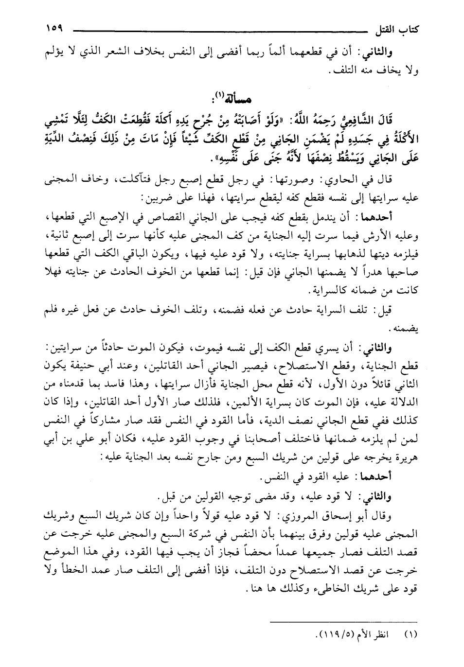 والثاني: أن يسري قطع الكف إلى نفسه فيموت، فيكون الموت حادثًا من سرايتين. قطع الجناية، وقطع الاستصلاح، فيصير الجاني أحد القاتلين، وعند أبي حنيفة يكون الثاني قاتلًا دون الأول، لأنه قطع محل الجناية فأزال سرايتها، وهذا فاسد بما قدمناه من الدلالة عليه، فإن الموت كان بسراية الألمين، فلذلك صار الأول أحد القاتلين، وإذا كان كذلك ففي قطع الجاني نصف الدية، فأما القود في النفس فقد صار مشاركًا في النفس لمن لم يلزمه ضمانها فاختلف أصحابنا في وجوب القول عليه، فكان أبو علي بن أبي هريرة يخرجه على قولين من شريك السبع ومن جارح نفسه بعد الجناية عليه: