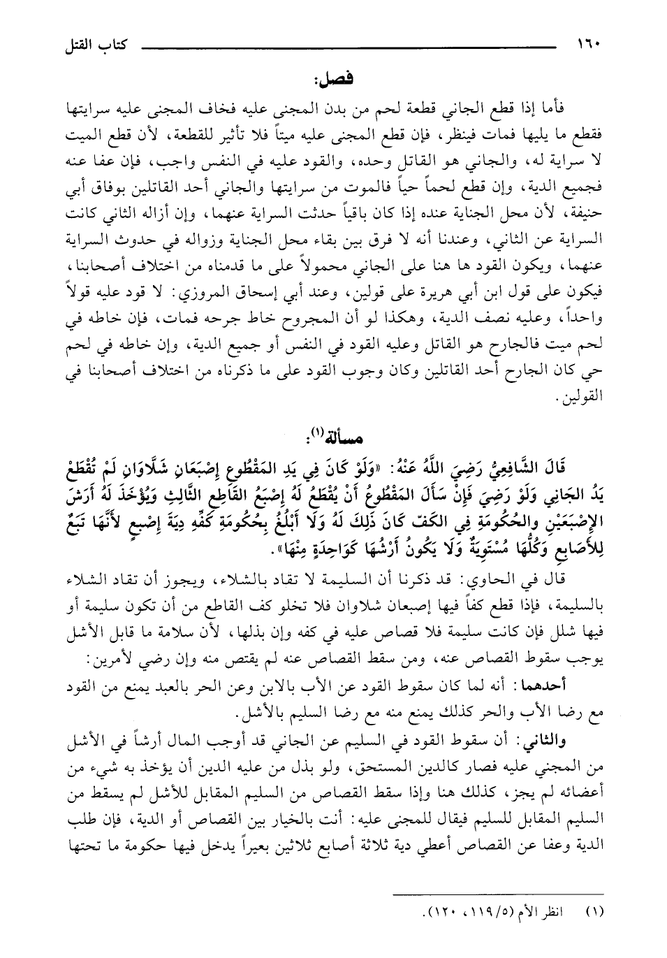 قال الشافعي رضي الله عنه: ((ولو كان في يد المقطوع إصبعان شلاوان القصاص في اليد لم تقطع يد الجاني ولو رضي فإن سأل المقطوع أن يقطع له إصبع القاطع الثالث ويؤخذ له أرش الإصبعين والحكومة في الكف كان ذلك له ولا أبلغ بحكومة كفه دية إصبع لأنها تبع للأصابع وكلها مستوية ولا يكون أرشها كواحدة منها ((.