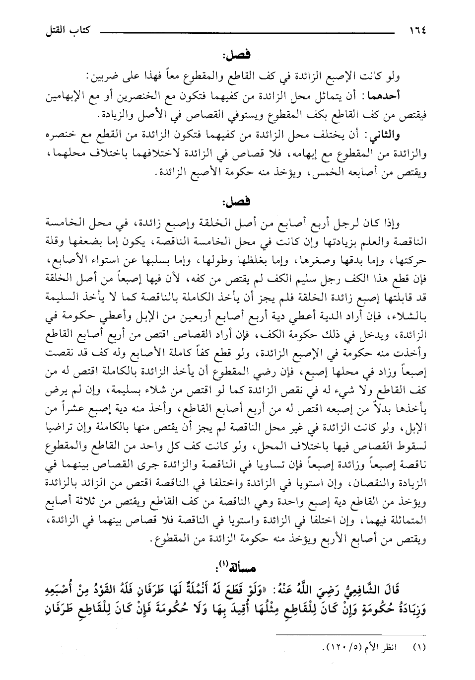 وإذا كان لرجل أربع أصابع من أصل الخلقةً وإصبع زائدةً في محل الخامسة الناقصة، والعلم بزيادتها وإن كانت في محل الخامسةً الناقصةً يكون إما بضعفها وقلة حركتها، وإما بدقها وصغرها، وإما بغلظها وطولها، وإما بسلبها عن استواء الأصابع، فإن قطع هذا الكف رجل سليم الكف لم يقتص من كفه، لأن فيها إصبعا من أصل الخلقة قد قابلتها إصبع زائدةً الخلقةً فلم يجز أن يأخذ الكاملة بالناقصة كما لا يأخذ السليمة بالشلاء، فإن أراد الدية أعطي دية أربع أصابع أربعين من الإبل وأعطي حكومةً في الزائدة، ويدخل في ذلك حكومةً الكف، فإن أراد القصاص اقتص من أربع أصابع القاطع وأخذت منه حكومة في الإصبع الزائدة، ولو قطع كفا كاملة الأصابع وله كف قد نقصت إصبعا وزاد في محلها إصبع، فإن رضي المقطوع أن يأخذ الزائدة بالكاملةً اقتص له من كف القاطع ولا شيء له في نقص الزائدة كما لو اقتص من شلاء بسليمةً، وإن لم يرض يأخذها بدلا من إصبعه اقتص له من أربع أصابع القاطع، وأخذ منه دية إصبع عشرا من الإبل، ولو كانت الزائدة في غير محل الناقصة لم يجز أن يقتص منها بالكاملة وإن تراضيا لسقوط القصاص فيها باختلاف المحل، ولو كانت كف كل واحد من القاطع والمقطوع ناقصةً إصبعًا وزائدةً إصبعًا فإن تساويا في الناقصةً والزائدةً جرى القصاص بينهما في الزيادة والنقصان، وإن استويا في الزائدةً واختلفا في الناقصة اقتص من الزائدة بالزائدة ويؤخذ من القاطع دية إصبع واحدةً وهي الناقصة من كف القاطع ويقتص من ثلاثة أصابع المتماثلة فيهما، وإن اختلفا في الزائدة واستويا في الناقصة فلا قصاص بينهما في الزائدة، ويقتص من أصابع القاطع الأربع ويؤخذ منه حكومة الزائدةً من المقطوع.