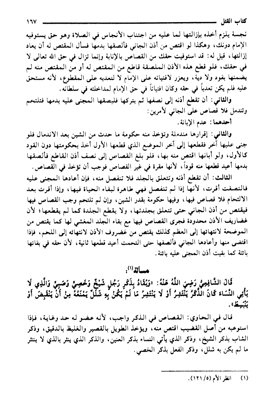 قال الشافعي رضي الله عنه: ((ويقاد بذكر رجل شيخ وخصي وصبي والذي لا يأتي النساء، كان الذكر ينتشر أو لا ينتشر ما لم يكن به شلل يمنعه من أن ينقبض أو ينبسط.