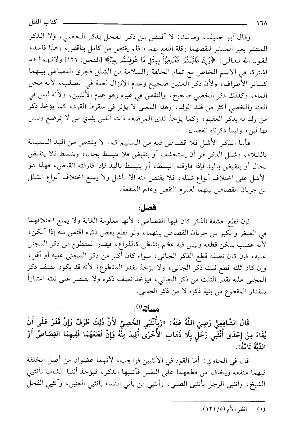 وقال أبو حنيفة، ومالك: لا أقتص من ذكر الفحل بذكر الخصي، ولا الذكر المنتشر بغير المنتشر لنقصهما وقلة النفع بهما فلم يقتص من كامل بناقص، وهذا فاسد، لقول الله تعالى {وَإِنْ عَاقَبْتُمْ فَعَاقِبُوا بِمِثْلِ مَا عُوقِبْتُم بِهِ} [النحل: 126]. ولأنهما قد اشتركا في الاسم الخاص مع تمام الخلقة والسلامة من الشلل فجرى القصاص بينهما كسائر الأطراف، ولأن ذكر العنين صحيح وعدم الإنزال لعلة في الصلب، لأنه محل الماء، وكذلك ذكر الخصي صحيح، والنقص في غيره وهو عدم الأنثيين، ولأنه ليس في العنة والخصي أكثر من فقد الولد، وهذا المعنى لا يؤثر في سقوط القود، كما يؤخذ ذكر من ولد له بذكر العقيم، وكما يؤخذ ثدي المرضعةً ذات اللبن بثدي من لا ترضع وليس لها لبن، وفيما ذكرناه انفصال. فأما الذكر الأشل فلا قصاص فيه من السليم كما لا يقتص من اليد السليمة بالشلاء، وشلل الذكر هو أن يستحشف أو ينقبض فلا ينبسط بحال، وينبسط فلا ينقبض بحال أو ينقبض باليد فإذا فارقته انبسط، أو ينبسط باليد فإذا فارقته انقبض، فهذا هو الأشل على اختلاف أنواع شلله، فلا يقتص منه إلا بأشل ولا يمنع اختلاف أنواع الشلل من جريان القصاص بينهما لعموم النقص وعدم المنفعة.