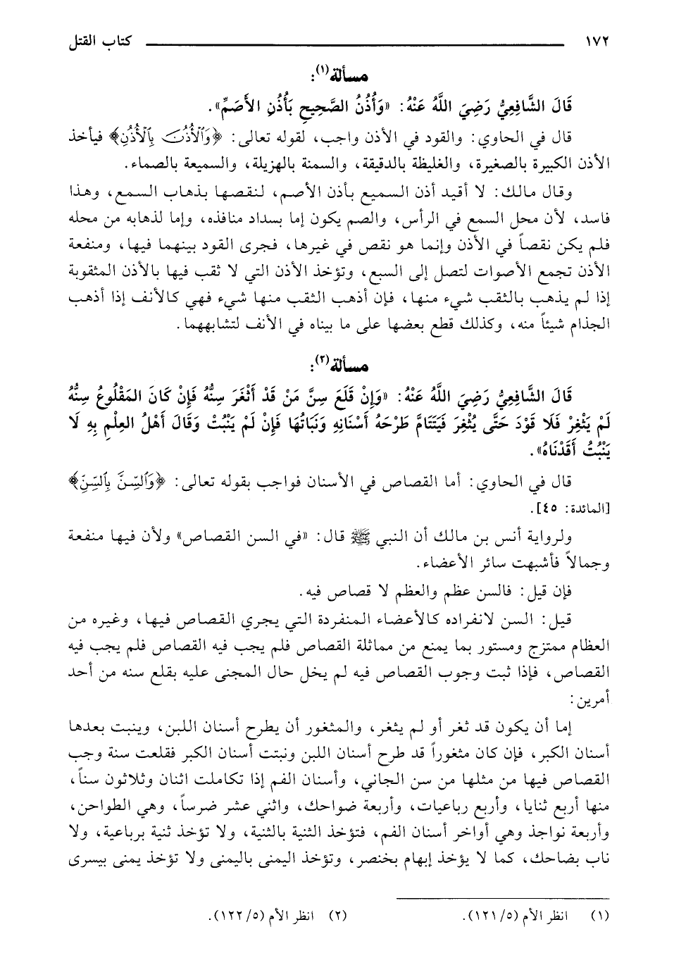 قال الشافعي رضي الله عنه: ((وإن قلع سن من قد أثغر سنه هل يجب القصاص فإن كان المقلوع سنه لم يثغر فلا قود حتى يثغر فيتتام طرحة أسنانه ونباتها فإن لم ينبت، وقال أهل العلم به لا ينبت أقدناه)) قال في الحاوي: أما القصاص في الأسنان فواجب بقوله تعالى: {وَالسِّنَّ بِالسِّنِّ} [المائدة: 45]. ولرواية أنس بن مالك أن النبي - صلى الله عليه وسلم - قال: في السن القصاص ولأن فيها منفعةً وجمالًا فأشبهت سائر الأعضاء.