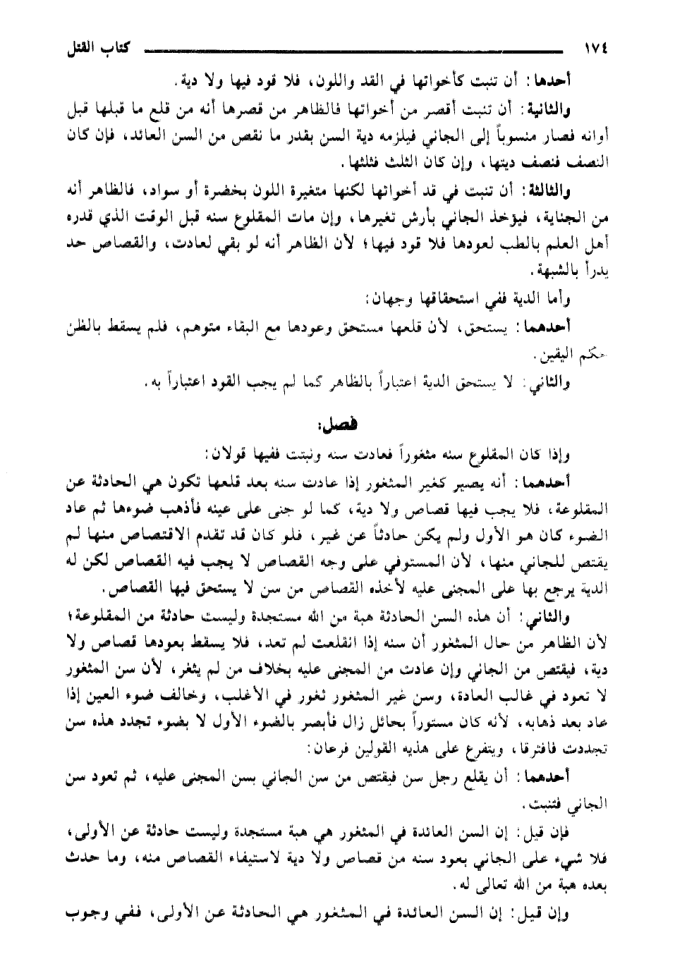 والثاني: أن هذه السن الحادثة هبة من الله مستجدة وليست حادثة من المقلوعة، لأن الظاهر من حال المثغور أن سنه إذا انقلعت لم تعد، فلا يسقط بعودها قصاص ولا دية، فيقتص من الجاني وإن عادت من المجني عليه بخلاف من لم يثغر، لأن سن المثغور لا تعود في غالب العادة، وسن غير المثغور تعود في الأغلب، وخالف ضوء العين إذا عاد بعد ذهابه، لأنه كان مستورًا بحائل زال فأبصر بالضوء الأول لا بضوء تجدد وهذه سن تجددت فافترقا، ويتفرع على هذين القولين فرعان: