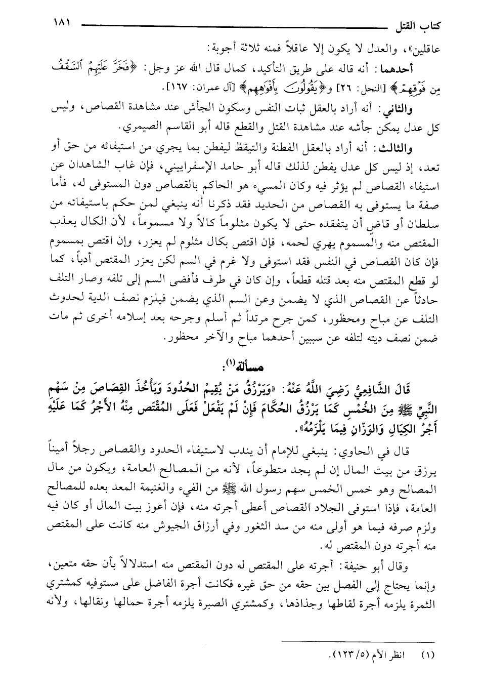 قال الشافعي رضي الله عنه: ((ويرزق من يقيم الحدود ويأخذ القصاص من سهم النبي صلى الله عليه وسلم من الخمس كما يرزق الحكام فإن لم يفعل فعلى المقتص منه الأجر كما عليه أجر الكيال والوزان فيما يلزمه)).