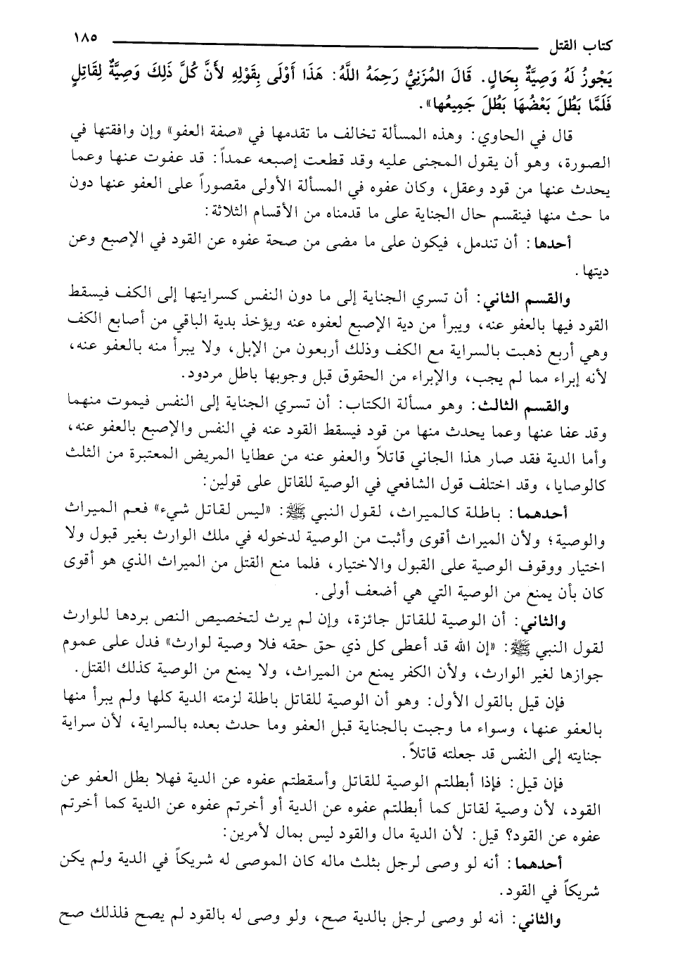 فإن قيل: فإذا أبطلتك الوصية للقاتل وأسقطتم عفوه عن الدية فهلا بطل العفو عن القود، لأن وصية لقاتل كما أبطلتم عفوه عن الدية أو أخرتم عفوه عن الدية كما أخرتم عفوه عن القود؟ قيل: لأن الدية مال والقود ليس بمال لأمرين: